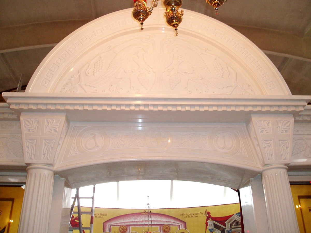 Η εταιρεία “BAIRAKTARIS MARBLE S.A” ανέλαβε την κατασκευή όλων των μαρμάρινων στοιχείων του ναού. Κατασκεύασε το τέμπλο, τα μαρμάρινα προσκυνητάρια, τον δεσποτικό θρόνο την επένδυση των κολώνων και των τοίχων. Τα υλικά που χρησιμοποιήθηκαν είναι το λευκό μάρμαρο SIVEC και το κόκκινο μάρμαρο ΕΡΕΤΡΙΑΣ.